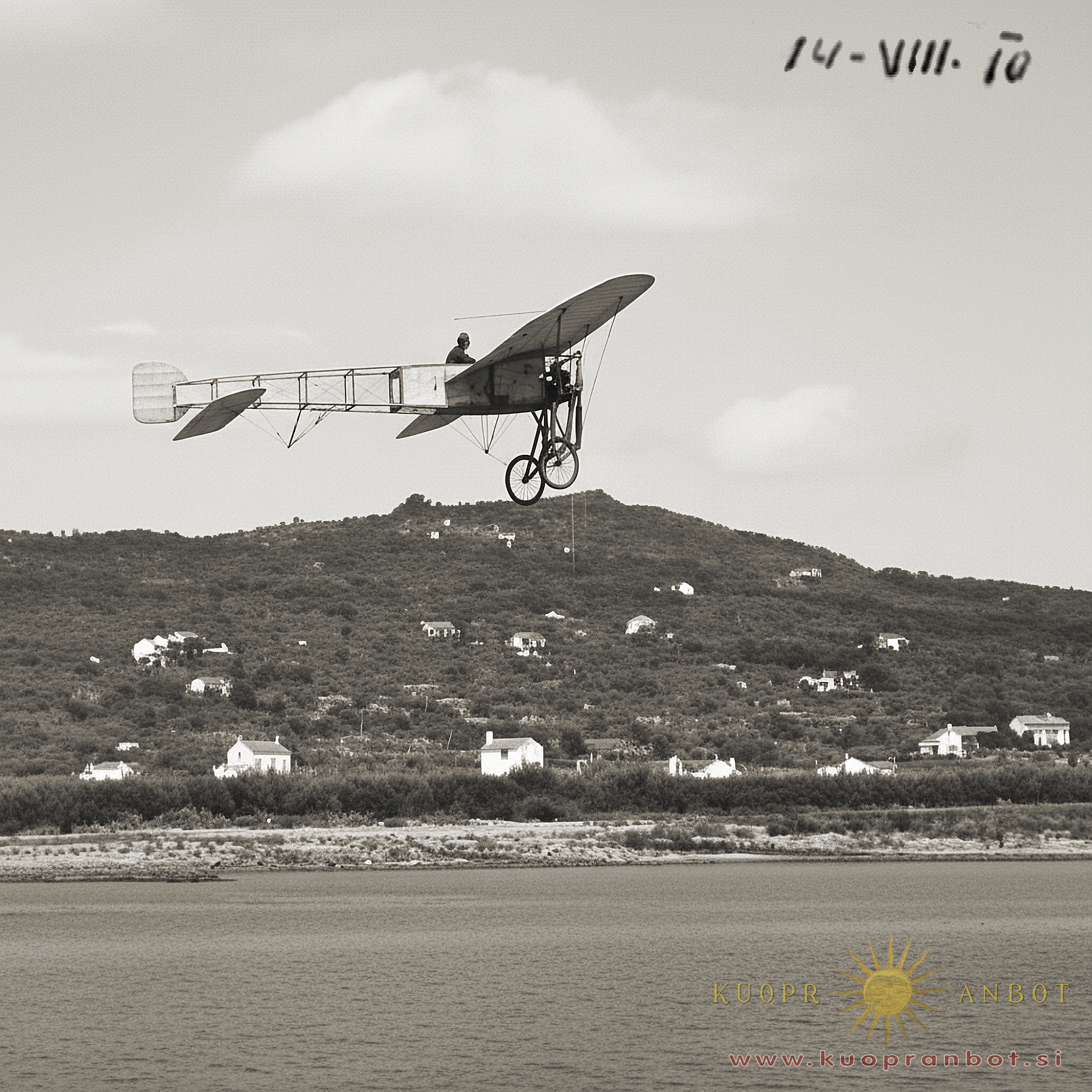 Ob priliki Prve istrske razstave v našem mestu leta 1910 so organizatorji med mnogimi drugimi atrakcijami organizirali tudi en tak mini letalski miting, na katerega so povabili dunajskega pilota Josefa Auerja, ki je s svojim enokrilnim Bleriotom očaral koprsko publiko. Ker takrat (no, tudi sedaj) ni bilo neke pristajalne steze v okolici, je najbrž uporabil kar cesto ki je šla od Mude do železniške postaje. Na sliki njegovega poleta vidimo solinarske hiše in Markovec v ozadju.