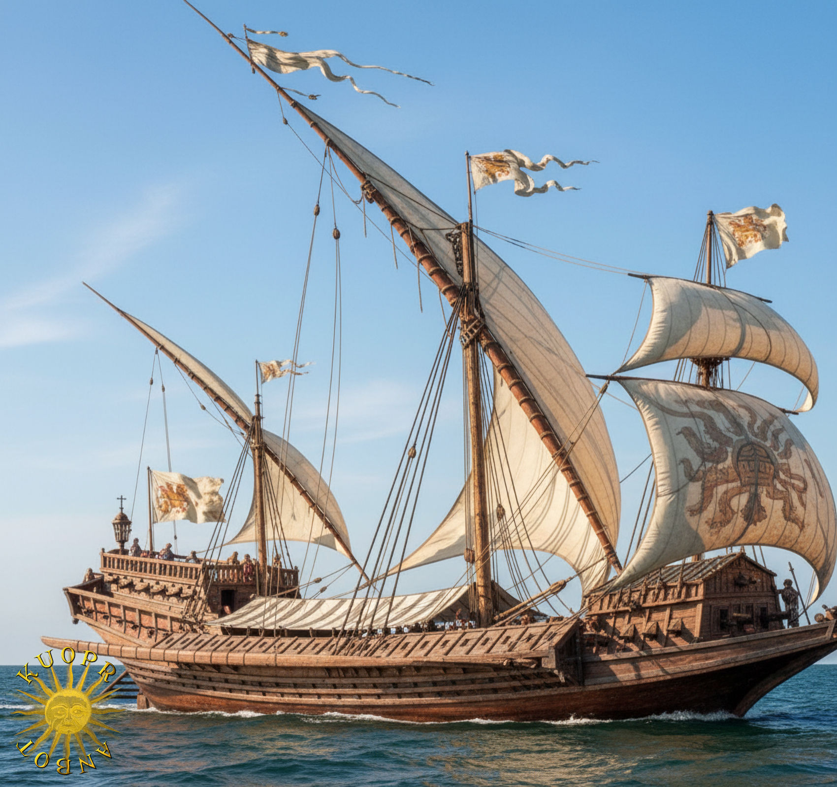 O Koprski vojaški galeji (4. slika) “Levinja z gorjačo” (Liona con mazza), je Boris že pisal, a poglejmo zgodbo malo bolj podrobno. Leta 1571 je bila pri Lepantu odločilna pomorska bitka med vzhodom in zahodom, za prevlado v Sredozemskem morju. V bitki so sodelovale tudi Istrske vojne galeje, a v ohranjenih zapisih so omenjene le 2; koprska Levinja z gorjačo in Sveti Nikolaj iz Cresa. Mesto Koper je za pomorsko vojaško silo Benetk moralo imeti pripravljeno eno vojno galejo z vojaki, veslači in vso opremo, ka ni bilo preprosto. Poveljstvo galeje in mesta nižjih poveljnikov so bila rezervirana za koprsko plemstvo. Vojake so prispevali plemiči, a preko 100 veslačev so na silo rekrutirali med zaporniki in preprostim ljudstvom. Torej skoraj zagotovo je bilo med veslači kar nekaj Slovencev in okolice Kopra, ki so sodelovali v bitki.
