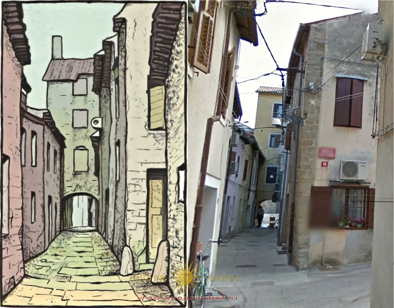 Opekarska ulica (Calle della fornace) – kar naj bi nakazovalo da so tam pekli opeke. Glede na to da imamo tam blizu pekarniško ulico (Calletta del forno) in da sta v italijanščini besedi forno in fornace tudi sopomenki, kar me je zavedlo, bi bilo zanimivo zvedet kaj so tam pekli – opeke so malo verjetne. Vsekakor pa je ta ulica dandanes v primerjavi s Kerinčičevim akvarelom izpred 50 let kar dobro ohranjena.